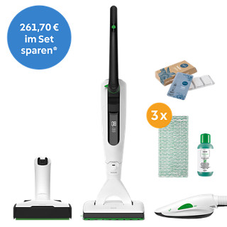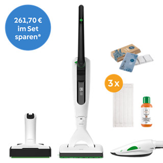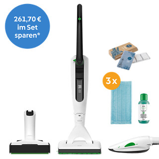 Das kabellose Power-Duo für die trockene und feuchte Bodenreinigung Im Set enthalten ist der noch effektivere, unabhängigere Kobold VK7 Akku-Staubsauger mit unfassbarer Akkulaufzeit und folgenden weiteren Aufsätzen: der EB7 Elektrobürste, die sich dank der automatischen Bodenerkennung ganz genau deinen Bodenverhältnissen anpasst, und dem SP7 Saugwischer der in einem Schritt saugt und wischt. Das Zubehör für den VK7 in Kombination mit dem SP7 ist für deine Holzböden wie Parkett ausgelegt. Die Kobold MF Reinigungstücher Parkett und das Reinigungskonzentrat Koboclean sorgen für eine schonende Tiefenreinigung deiner Holzböden. Produkte sowie Preisangabe nur gültig bei Bestellung innerhalb Österreichs. Gültig solange der Vorrat reicht. Nicht kombinierbar mit anderen Rabatten und Aktionen, Druck- und Satzfehler vorbehalten. Änderungen vorbehalten. Angaben ohne Gewähr.