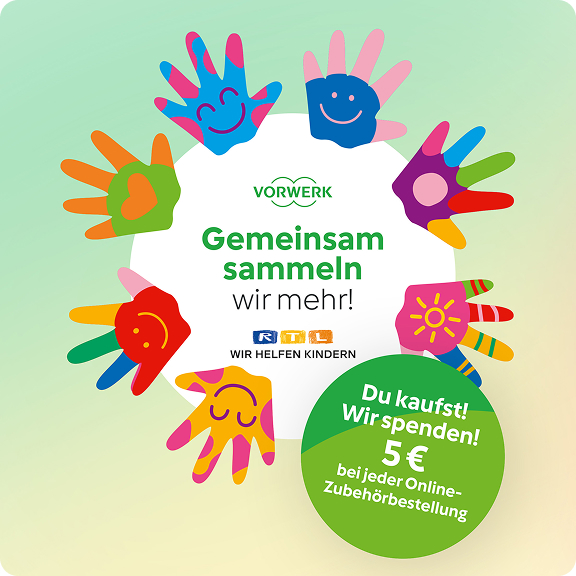 Mit jeder Online-Zubehörbestellung von dir spendet Vorwerk 5 € für Kinderhilfsprojekte an die "Stiftung RTL – Wir helfen Kindern e. V." ¹