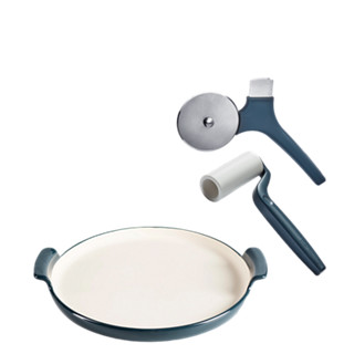Dein Set für Pizza wie aus dem Steinofen: der Original Thermomix® Pizzaschneider mit Randmesser und Klingenschutz, der Thermomix® Teigroller mit wechselbaren Rollen und der runde Pizzastein Peter.