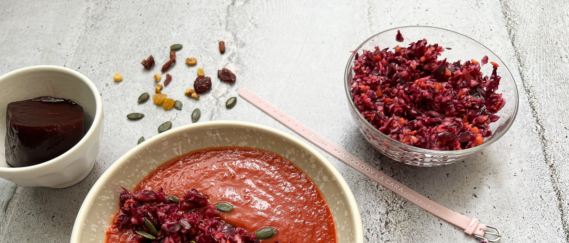 Gazpacho de remolacha con lombarda y pulsera AECC
