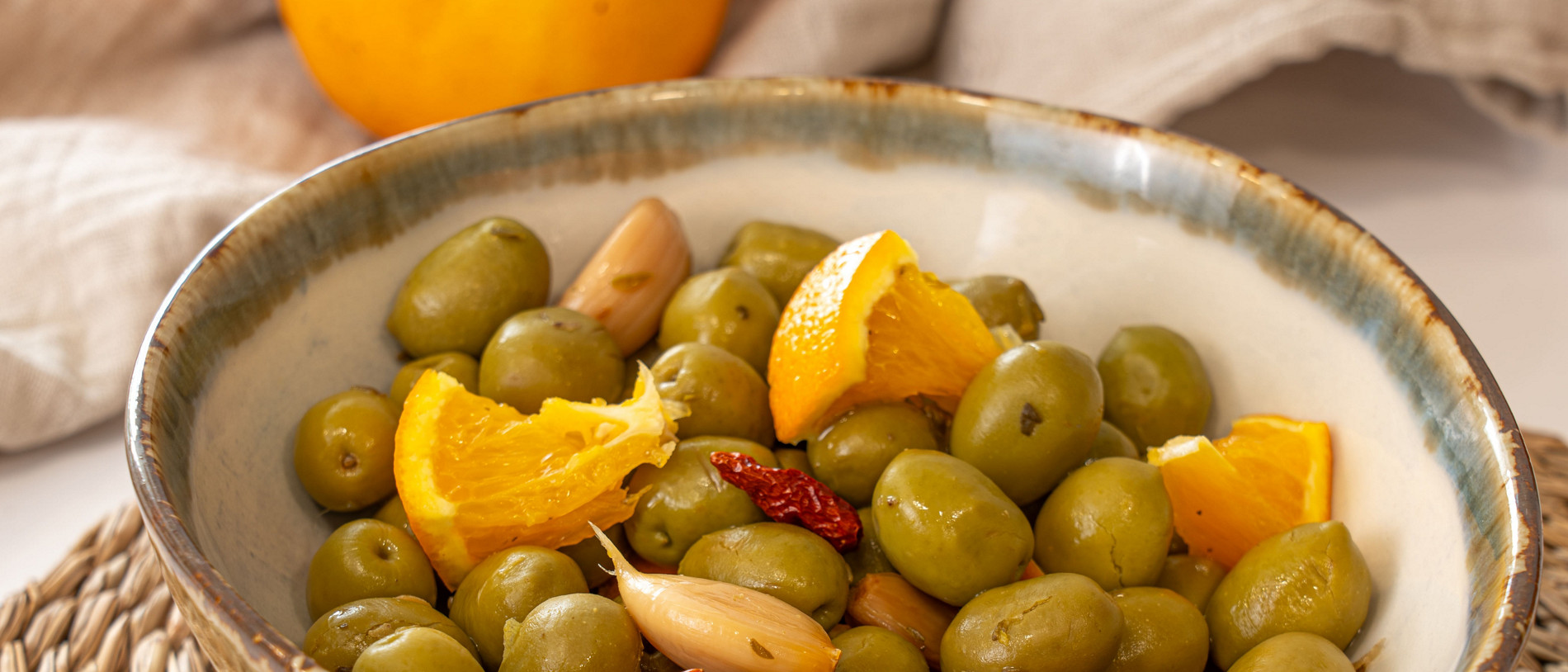 Aceitunas marinadas a la naranja. Deliciosas para los aperitivos del verano