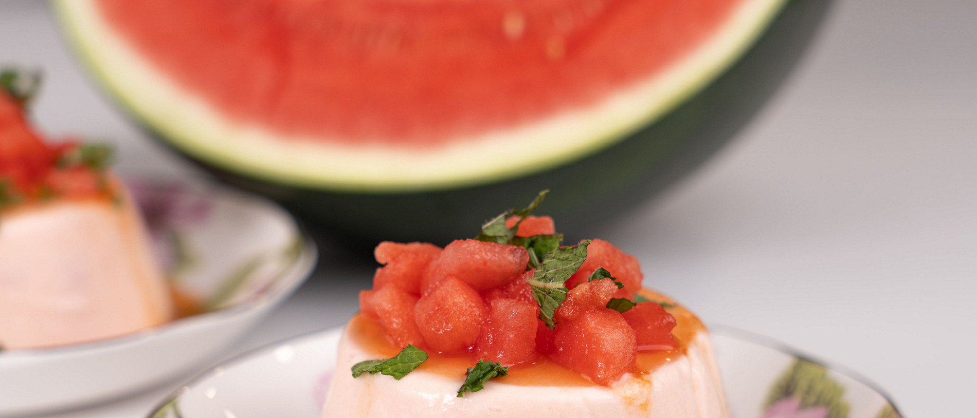 Este postre me ha sorprendido mucho. Una crema delicada con sabor a sandía y a nata. Una presentación preciosa para sorprender en la mesa. Un sirope de sandía que contrasta con la menta y además es muy sencillo de preparar, mejor dejarlo hecho el día anterior para que se cuaje perfectamente.