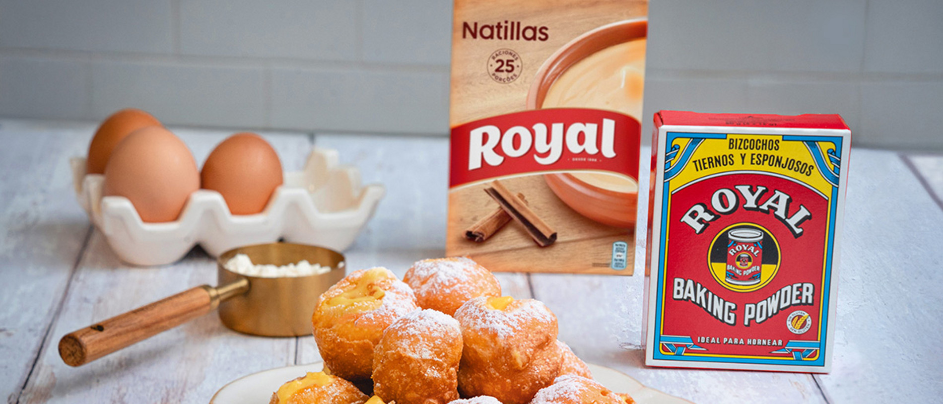 Para preparar la masa se utilizan ingredientes como harina, huevos, azúcar y polvos para hornear Royal, que ayudan a que los buñuelos queden más esponjosos y ligeros. Una vez fritos, se rellenan con una crema hecha con preparado para natillas Royal que aporta un sabor suave y una textura cremosa. Una combinación perfecta, ¡están buenísimos!