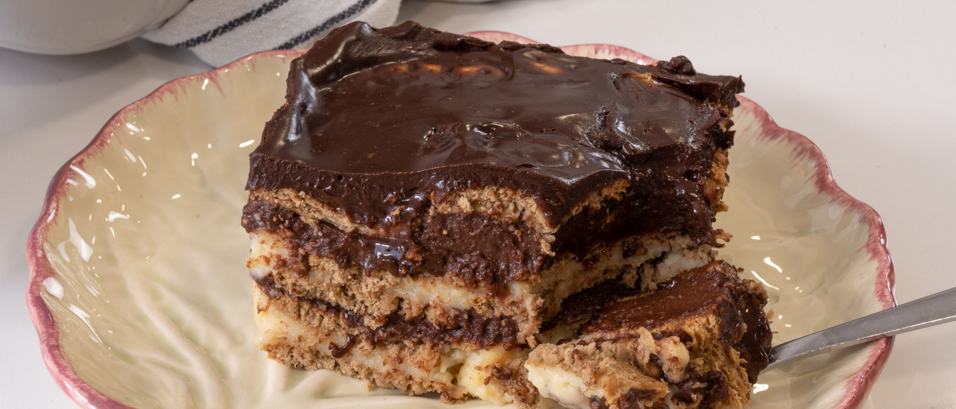 Esta tarta tiene mil versiones, pero a mi esta es la que más me gusta. Capas de galletas remojadas en leche, crema de vainilla y crema de chocolate. Para mi tiene un equilibrio de sabor muy rica y no es nada empalagosa. Pero puedes poner solo capas de crema de vainilla o solo de chocolate, eso ya al gusto ;)