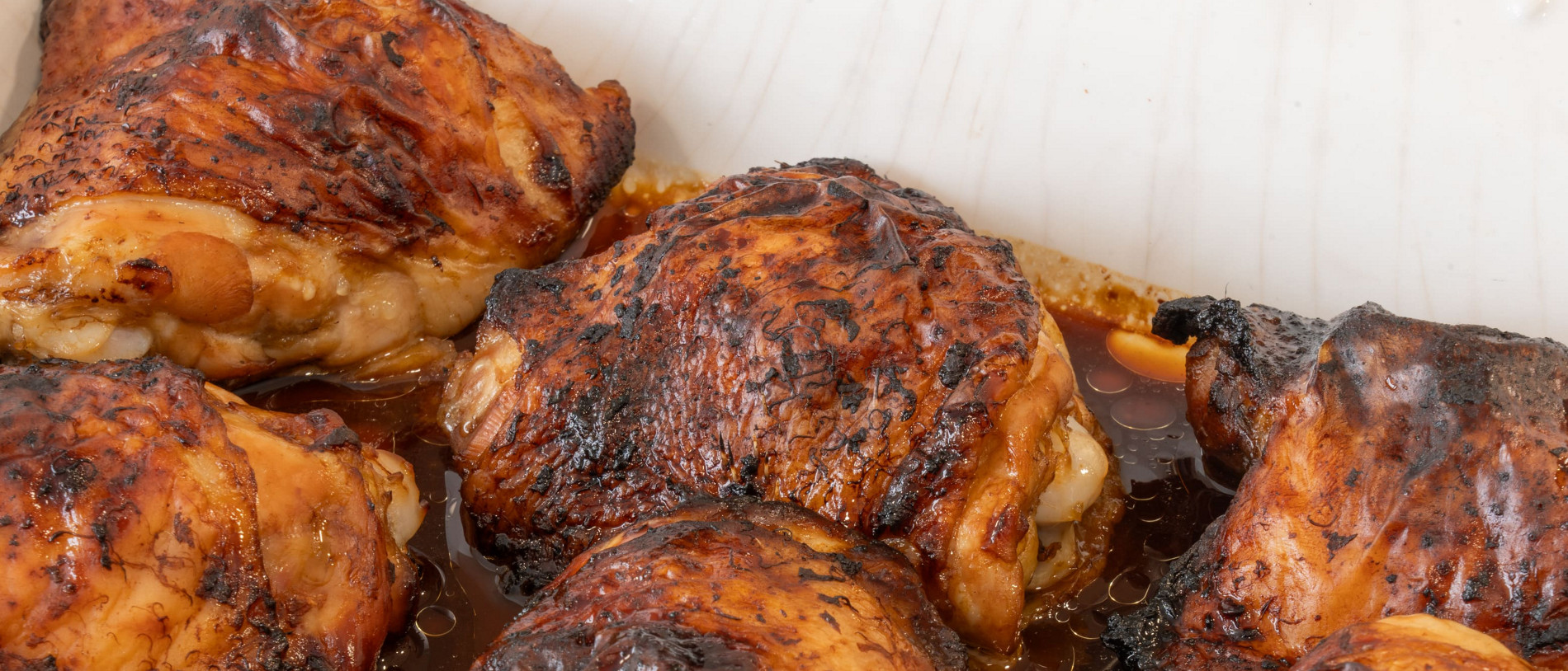 2. Al día siguiente, precaliente el horno a 200°C. Coloque los contramuslos con la piel hacia arriba en una fuente de horno y vierta sobre ellos la marinada.