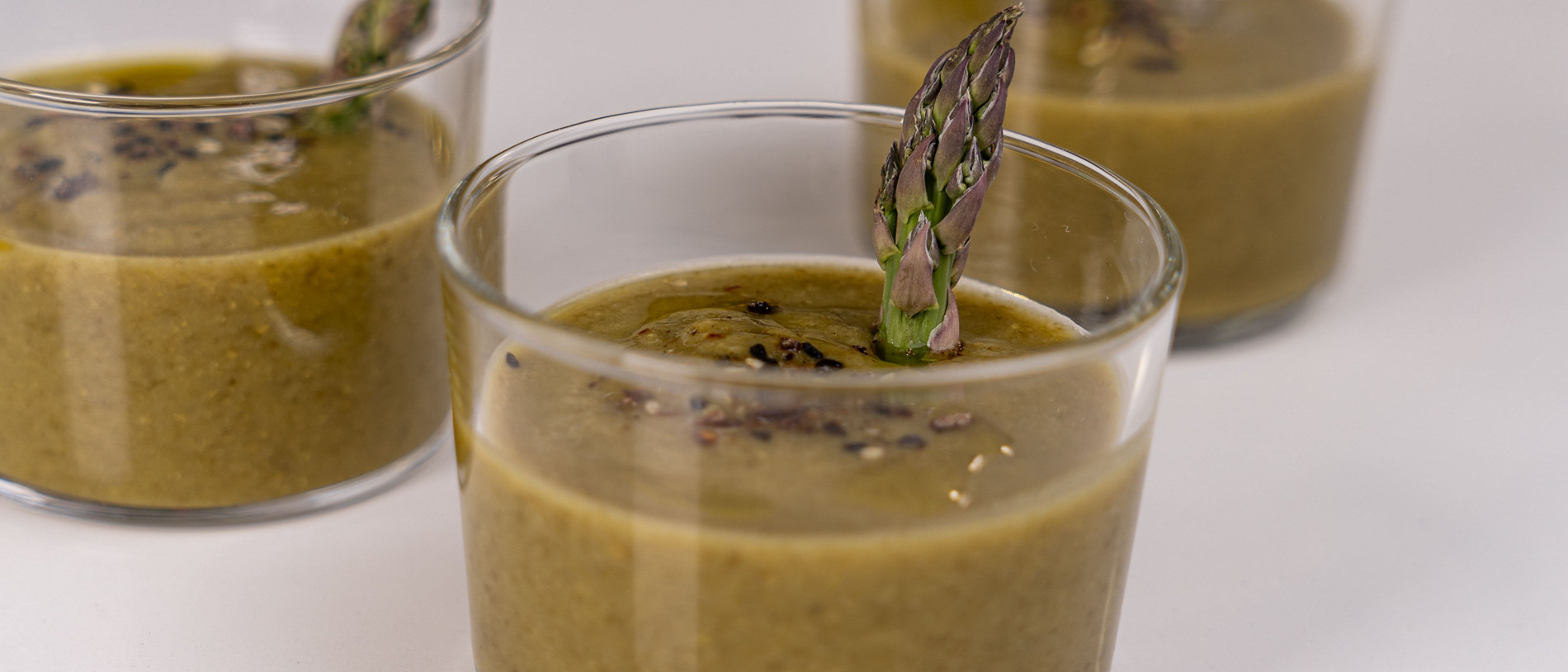 Esta vez la vamos a presentar en vasitos individuales y decorados con espárragos para darle un toque más formal. Perfecto para las comidas de verano.