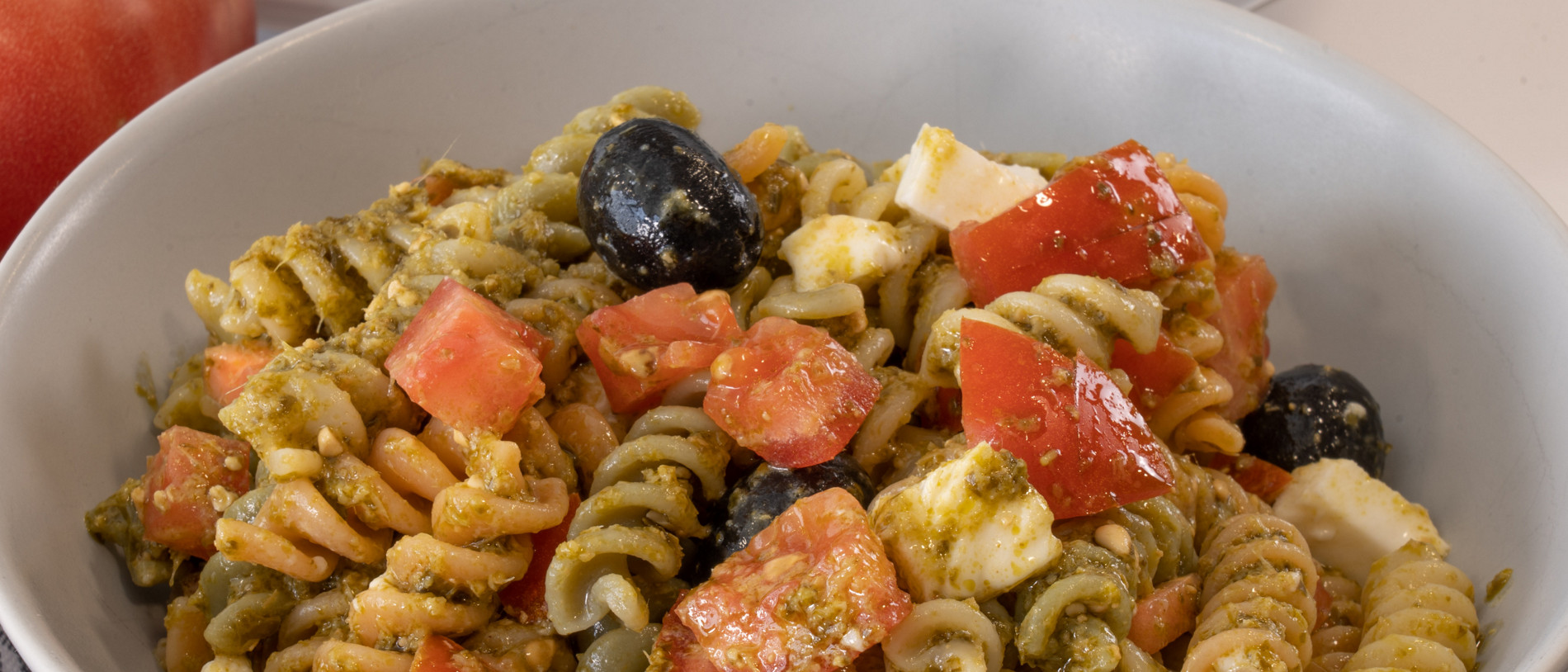 Esta ensalada italiana no puede ser más sencilla y está buenísima. Es una versión de la ensalada caprese, con pesto casero, mozzarella, tomate, aceitunas… muy rica y refrescante y además admite más ingredientes si te apetece ponerles.