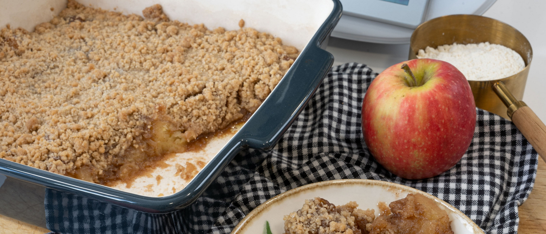 Esta receta de crumble de manzana en Thermomix® es una de mis favoritas, una compota de manzana con cobertura crujiente de galleta y saborcito a mantequilla y canela. La he preparado en la fuente para horno Alex, que es perfecta para hornear lasaña, bizcochos o asados para 4 personas… quedan genial.