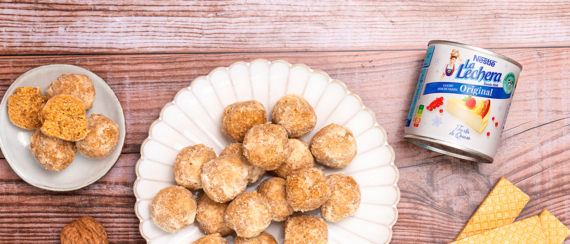 La mezcla lleva galletas de barquillo, leche condensada La lechera, les da dulzura y cremosidad a las galletas. Les damos formas y cubrimos con nuez y azúcar trituradas. Os van a encantar ;)