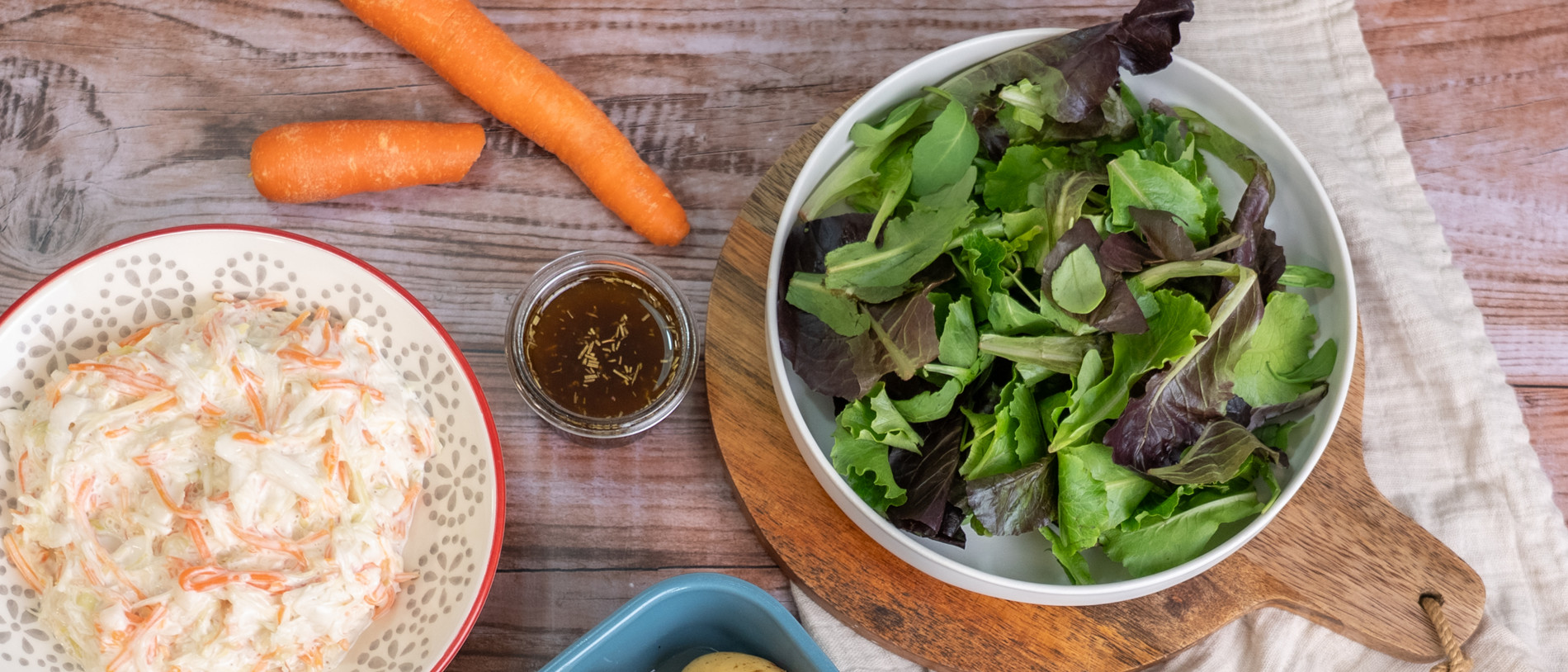 Esta ensalada es perfecta para barbacoas, ligera, con un aliño sabroso y para mí, la favorita en las barbacoas. No lleva nada, solo una mezcla de lechugas y el aliño, pero es fresca, crujiente y muy apetecible.