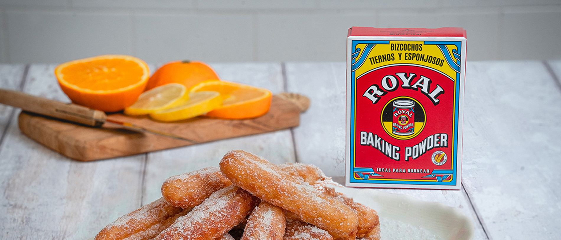 Para que la masa quede más ligera, se utiliza polvos para hornear Royal, que ayuda a que los huesillos tengan una textura más esponjosa. Una vez fritos, los espolvoreamos con azúcar glas, lo que les da un toque dulce muy característico.