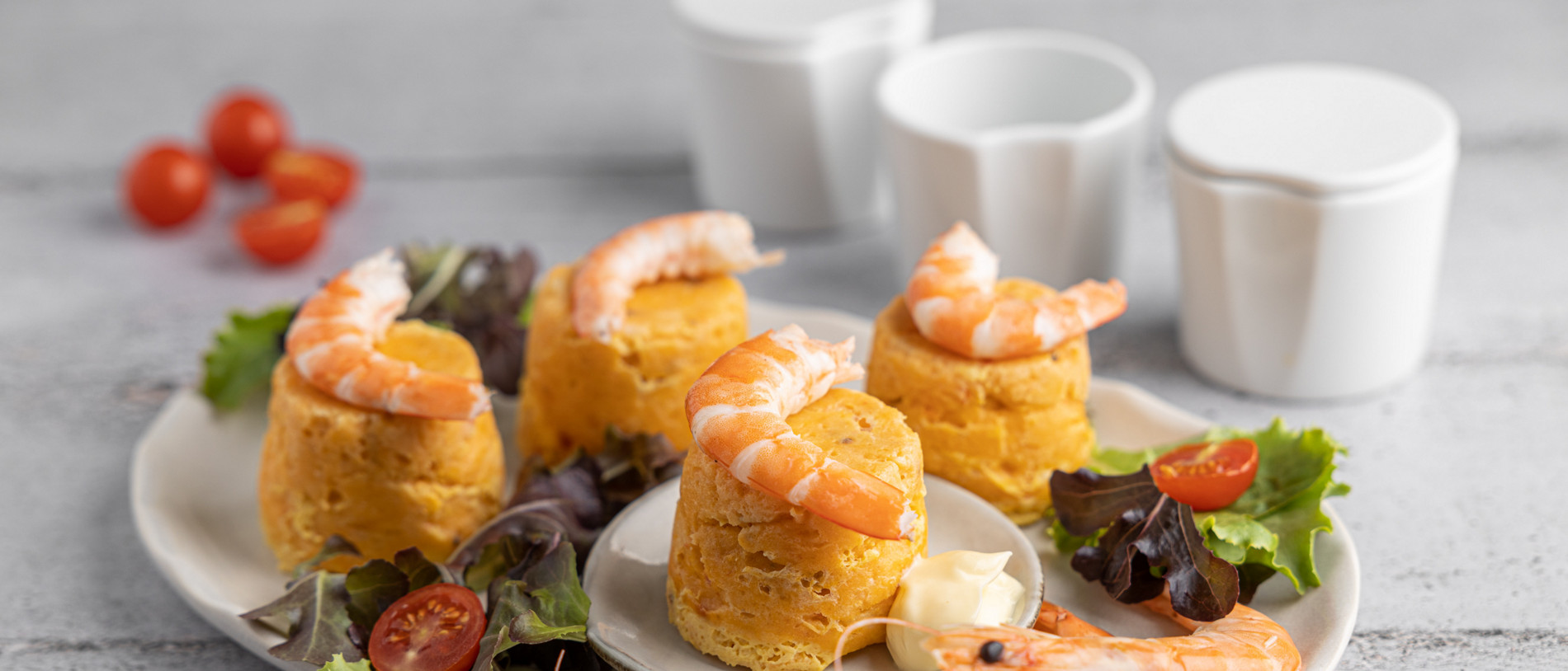 7. Incorpore los langostinos y sofría 2 min/120°C/vel 1. Mientras tanto, desmolde los mini pasteles en una fuente para servir. Coloque un langostino salteado en cada mini pastel y sirva con la ensalada y una cucharadita de mayonesa.