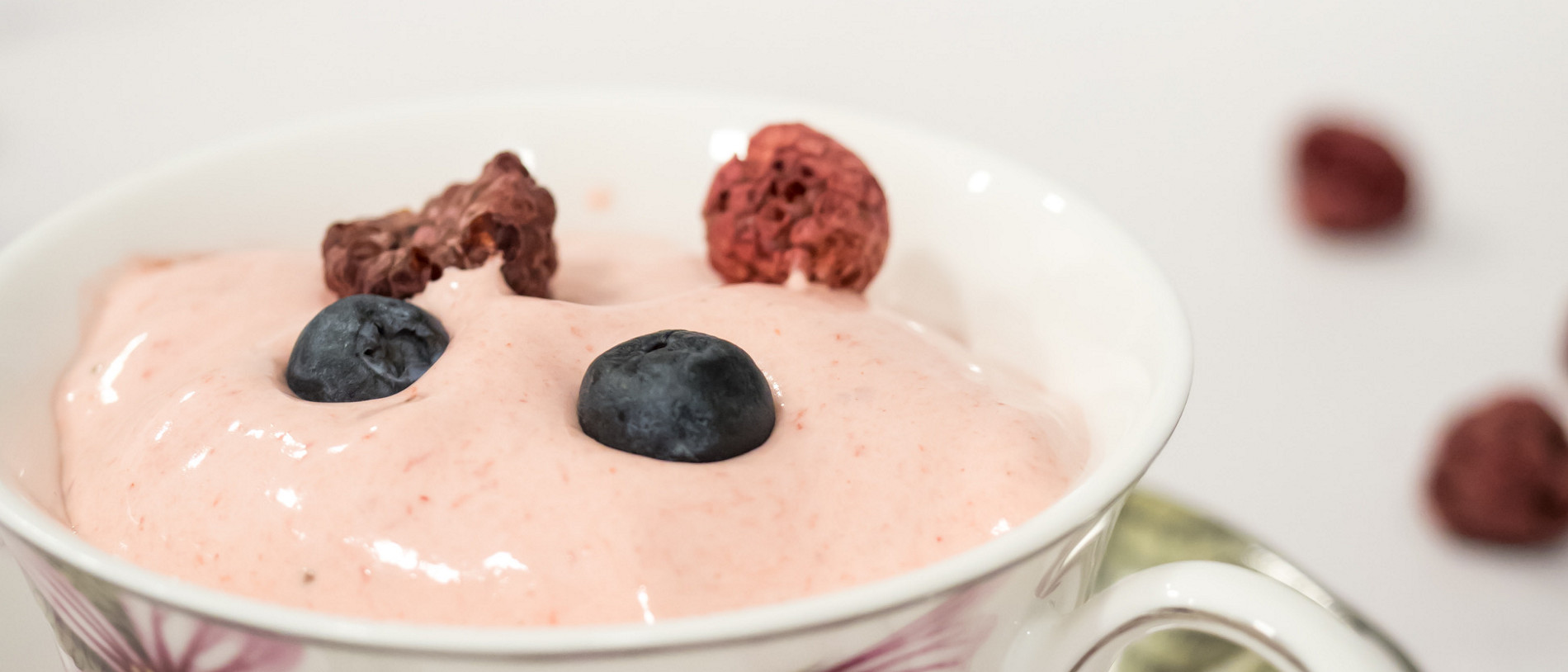 3. Coloque la mariposa en las cuchillas , incorpore las claras y bata 2 min/vel 4. Sirva fría en cuencos de postre, adornada con los frutos rojos frescos.