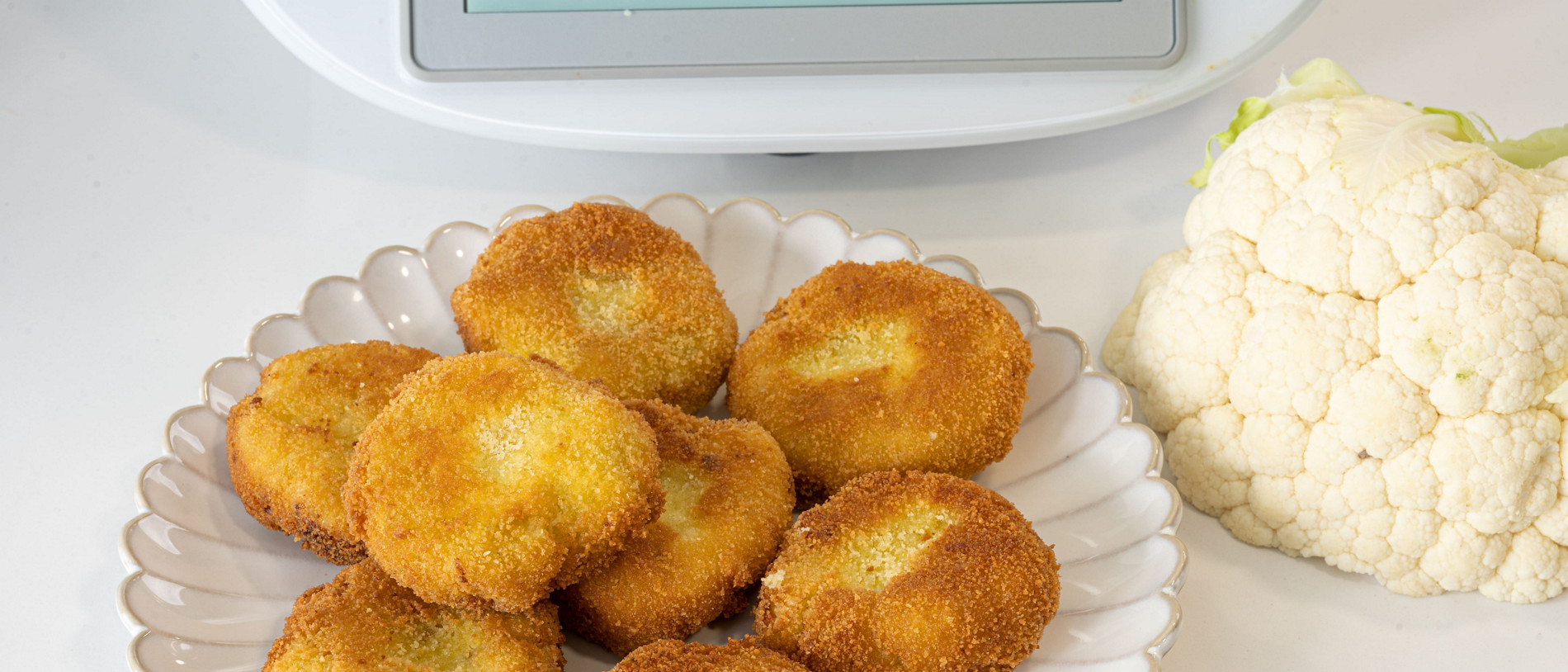 - Añada la coliflor cocida, la sal y 1 huevo. Programe 5 seg/vel 5. Con 2 cucharas, forme bolas y aplástelas ligeramente. Rebócelas en 1 huevo batido y en el pan rallado reservado.