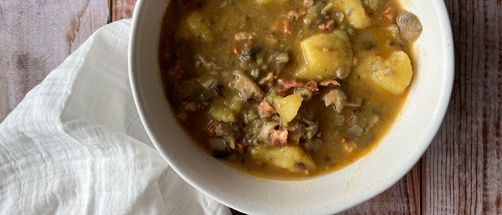Se prepara muy fácil con un sofrito de cebolla y ajo, rehogamos champiñones y jamón y guisamos las patatas en un caldito y buenísimas. Qué ricas y sencillas en Thermomix®.