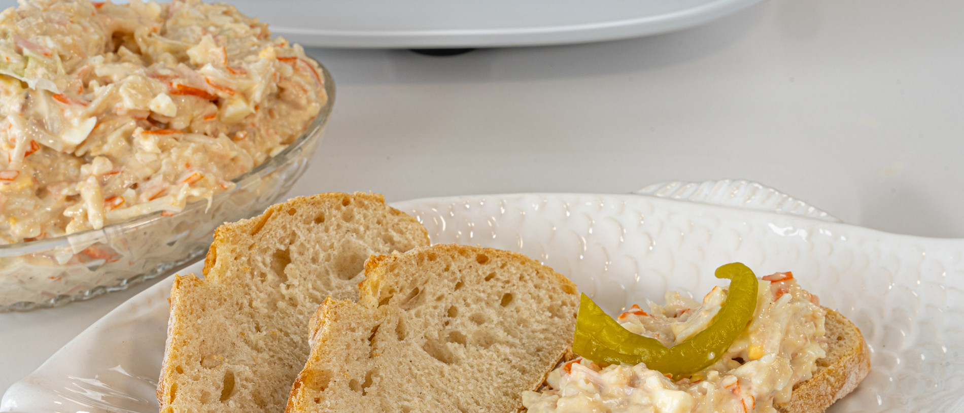 Rebanadas de pan y un untable con atún, huevo, cebolleta, cangrejo, mayonesa...súper rico y perfecto para una cena de picoteo. Me encanta acompañarlo de una ensalada, una tabla de picoteo, guacamole, hummus... en Cookidoo® hay muchas recetitas de picar. Queda delicioso y es un relleno perfecto para sandwiches también. Mi toque personal es añadirle un poquito de piparra para darle un toque picante!.