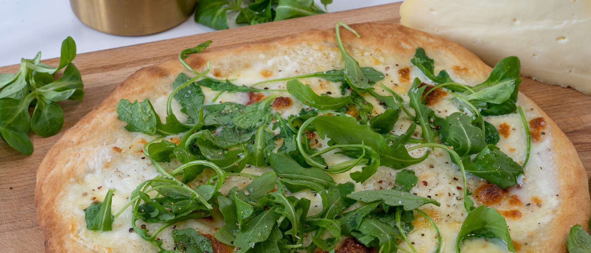 Disfruta de esta pizza blanca con todo el sabor del queso mozzarella y del queso tetilla y el toque amargo de la rúcula que hace una combinación perfecta.