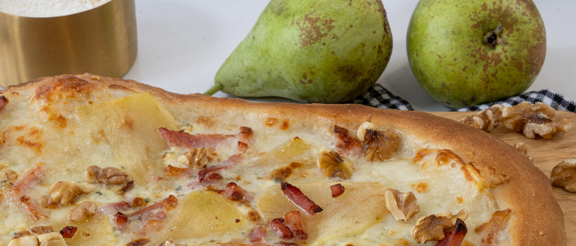 Esta con queso azul, bacon, pera y miel está buenísima, qué mezcla de sabores más deliciosa.