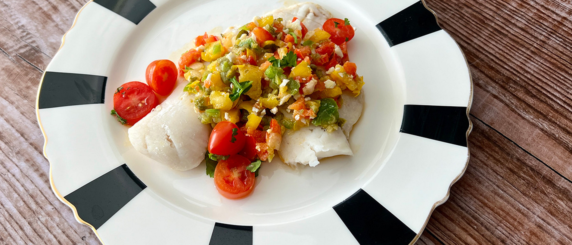 Platos de pescado fresco al vapor con Thermomix®. Merluza con vinagreta de encurtidos