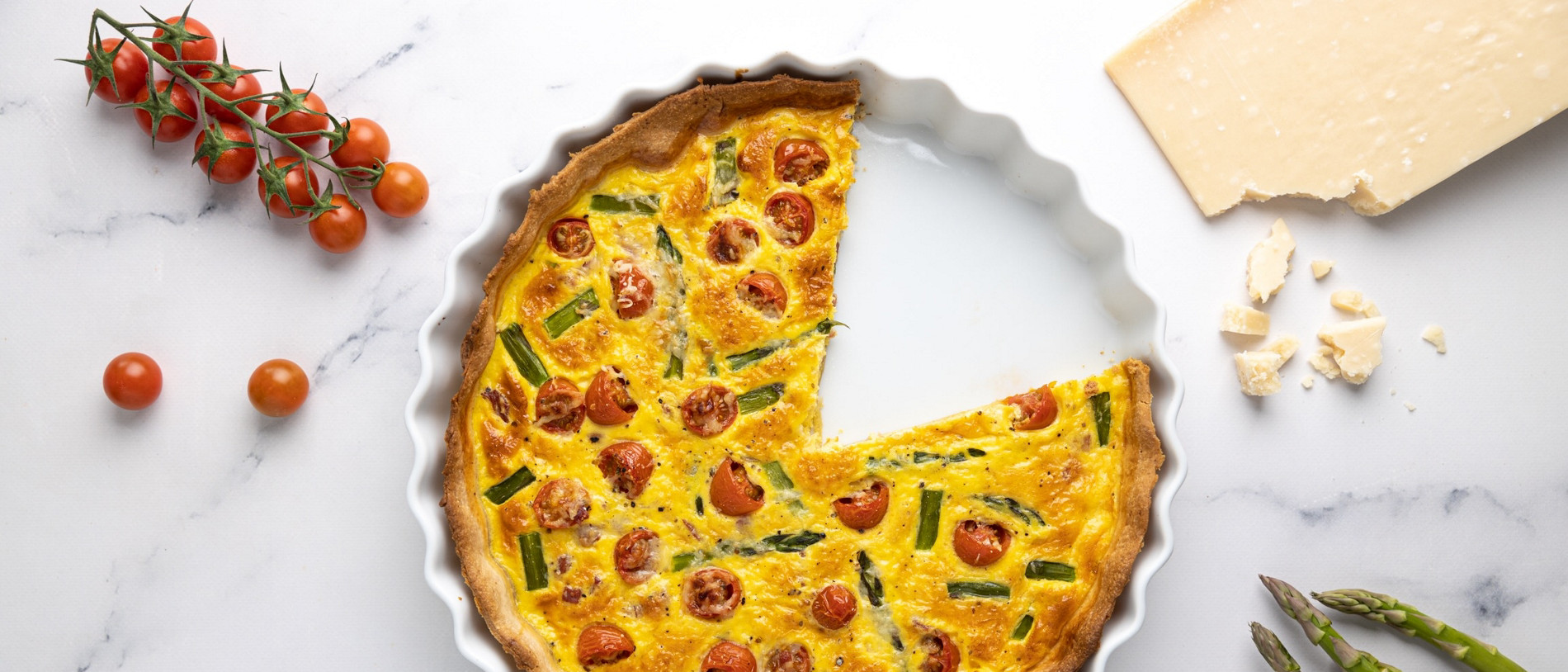 6. Reparta los espárragos sobre la masa y también los cherrie cortados por la mitad. Cubra con la mezcla de huevo. Espolvoree con el queso rallado y hornee durante 25 minutos (180°C) o hasta que esté dorada. Sirva templada o fría.