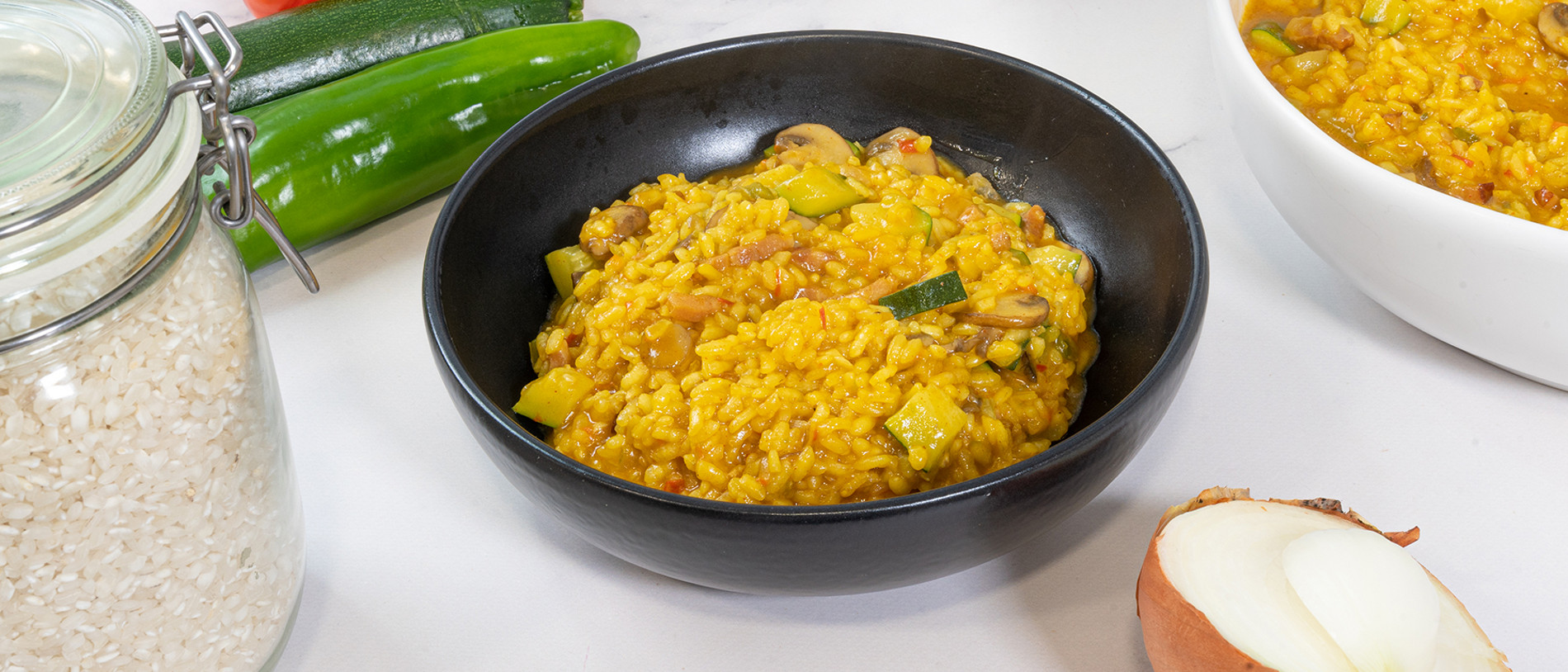 Esta receta de arroz cremoso al azafrán con calabacín, champiñones y bacon me parece una receta estupenda para esos días en los que no te quieres complicar demasiado y quieres preparar una receta rápida con tu Thermomix®, además es muy sabrosa y de esos platos que te ilusiona tener en la mesa, muy apetecible.