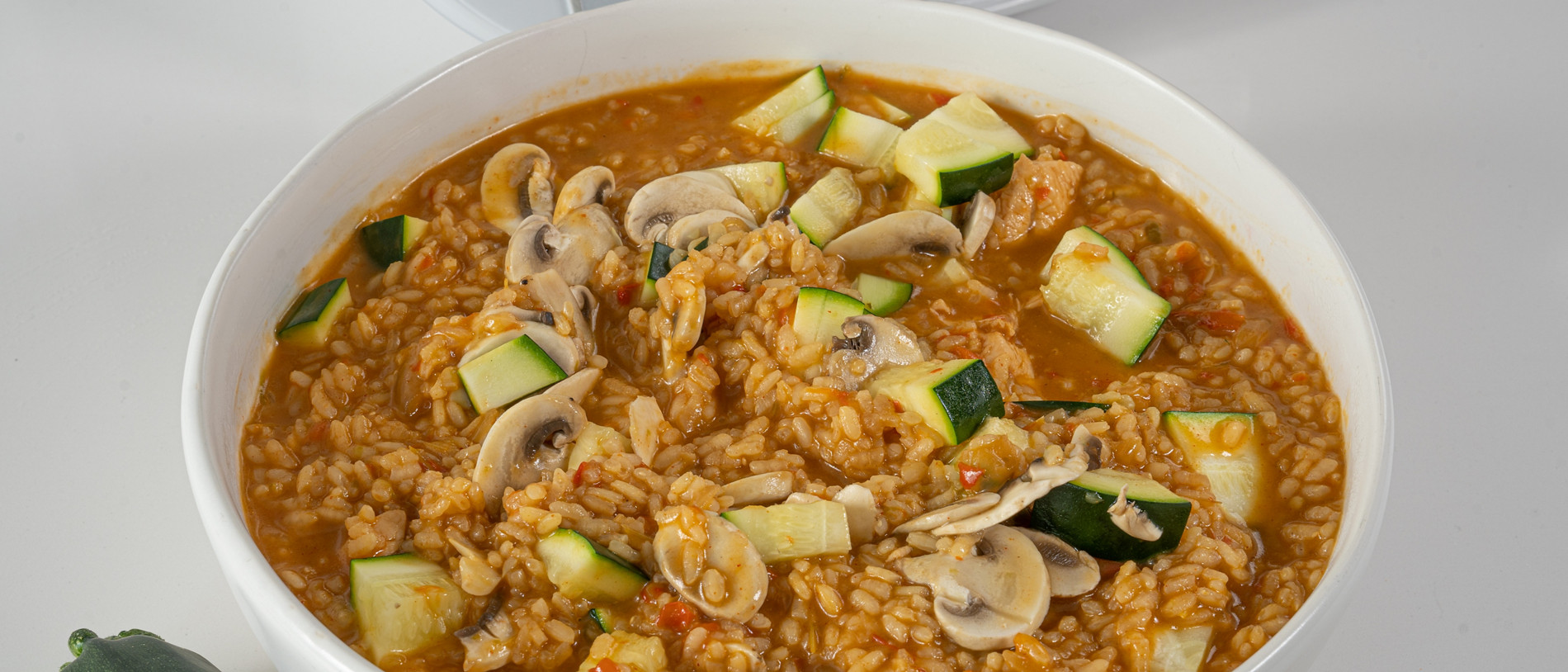 - Agregue el arroz, la pastilla de caldo, el pimentón, la sal, el colorante y el agua. Sitúe el recipiente Varoma en su posición con el calabacín y los champiñones. Tape el Varoma y programe 15 min/Varoma/giro inverso/vel cuchara. Retire el Varoma y ponga las verduras en una fuente. Vierta el arroz y mezcle delicadamente con la espátula. Deje reposar 5 minutos antes de servir.