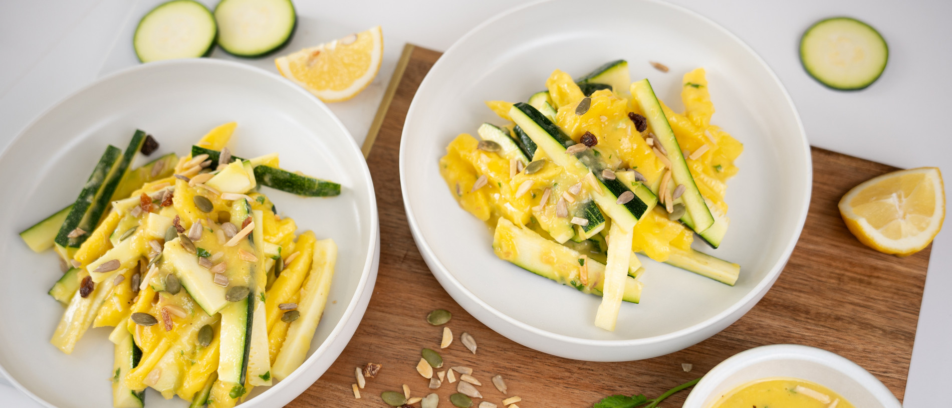 Esta ensalada me encanta, es fresca, sabrosa y el toque del aliño es delicioso. Bastones de calabacín y mango y un aliño con chalota, cilantro, lima y el punto crunchy de las pipas de calabaza.