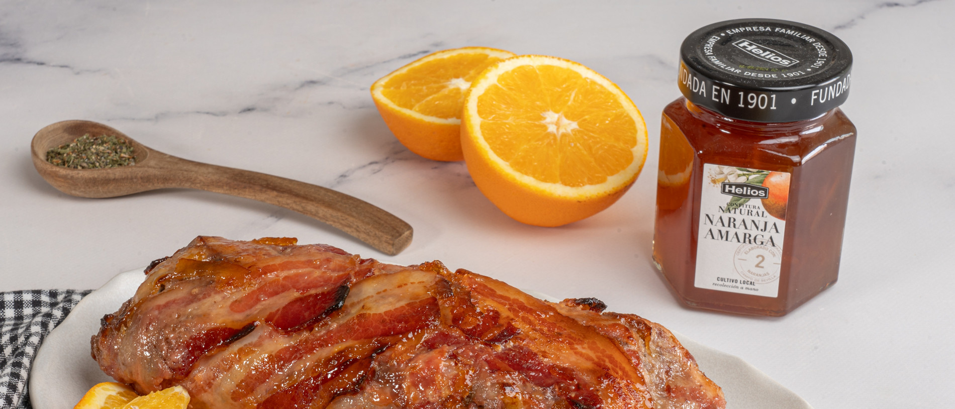 Rollo tres carnes con beicon caramelizado y confitura natural de naranja amarga Helios®