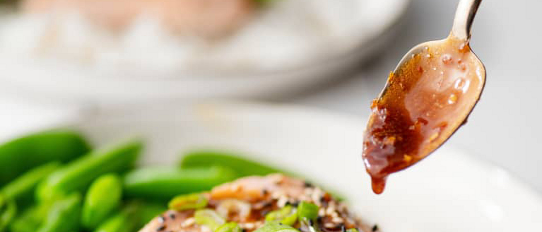 - Añada la miel, la salsa de soja, el ajo en polvo, el chile seco y la sal y, sin poner el cubilete, programe 5 min/120°C/vel 2. Sirva el salmón con el arroz y los guisantes. Riegue con el glaseado de jengibre y soja y decore con la cebolleta fresca y las semillas de sésamo tostadas.