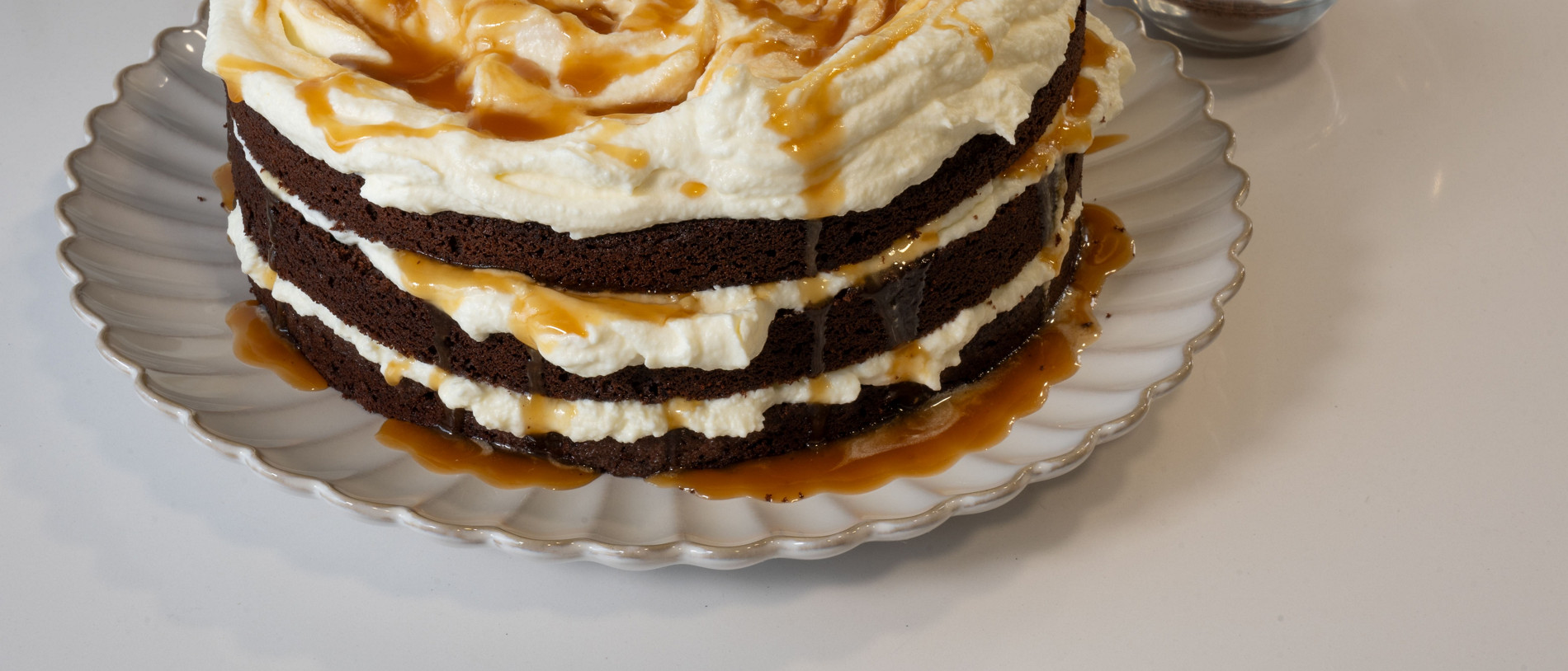 En mi casa siempre triunfa un buen postre y esta tarta de chocolate con nata y caramelo salado es una delicia. Capas de bizcocho de chocolate, relleno de nata montada y toffee salado…una combinación estupenda.