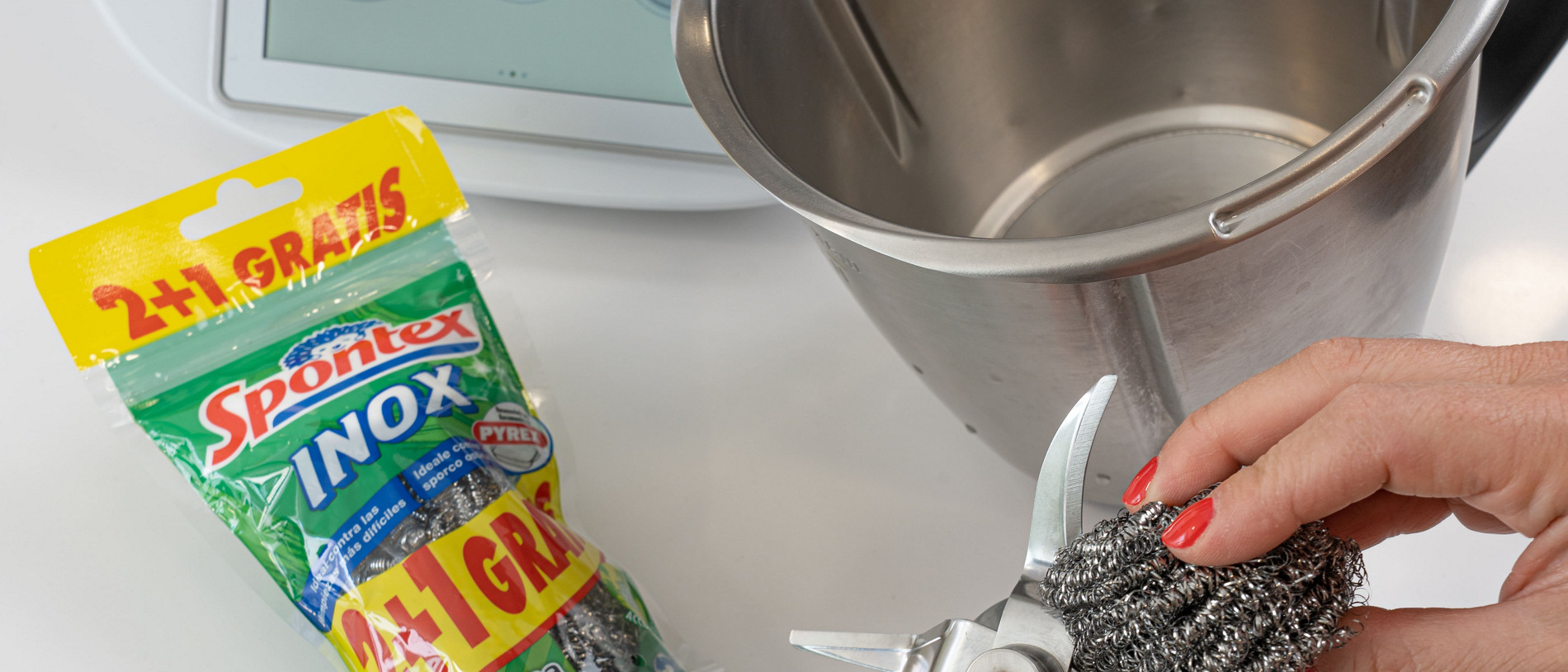 Después de algunas recetas, sobre todo a alta temperatura, hay restos que se quedan incrustados en las cuchillas y es complicado retirarlos. Para ello suelo hacer una buena limpieza con el modo prelavado que necesite y luego desmonto y retiro las cuchillas. Las limpio a fondo con Inox de Spontex, hecho de fibras recicladas.