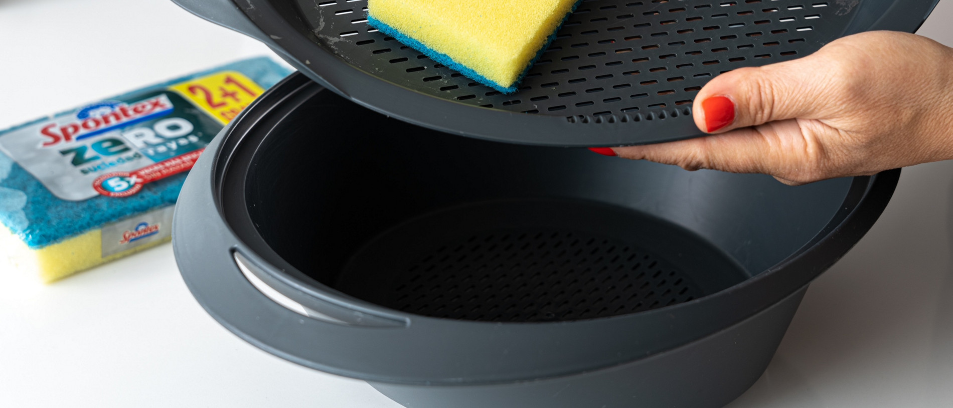Os tengo que confesar que lo que más perecilla me da luego es toda la limpieza sobre todo del varoma, sobre todo si preparo pescado al vapor. A veces se quedan restos de comida pegados y los agujeritos con restos de comida. Pero he encontrado un truco que me va genial: el estropajo Zero de Spontex. Gracias a su tecnología exclusiva hace posible que las partículas abrasivas no raya sean muy efectivas, desincrustando los restos de comida, súper práctico.