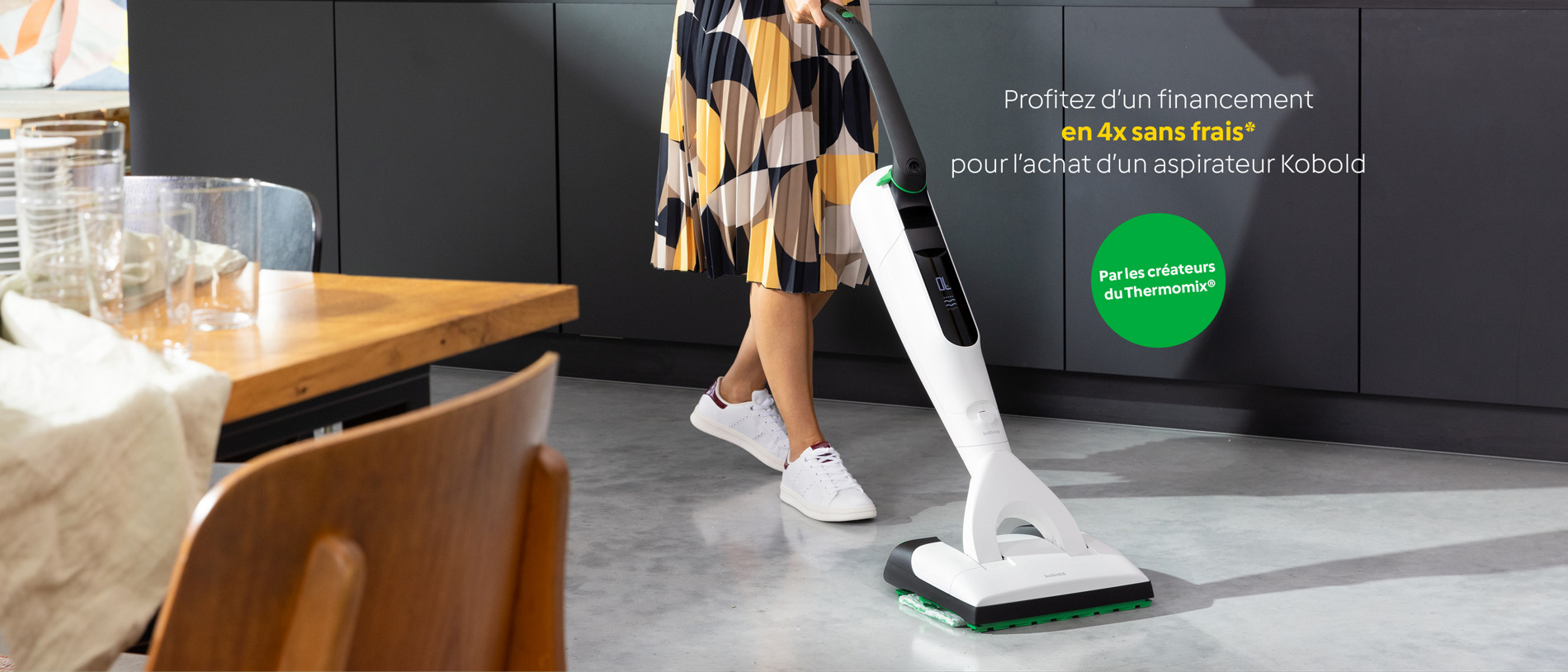 Jusqu'au 6 juillet 2025, pour l'achat d'un aspirateur Kobold, profitez d'un financement en 4 fois sans frais ou 36 fois à taux préférentiel*