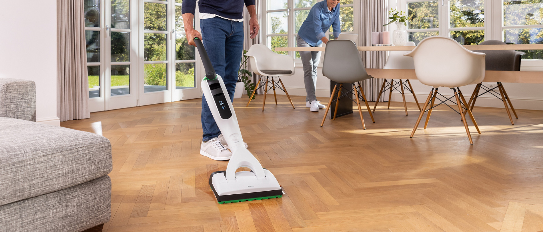 Avec le nouveau Kobold VK7, la brosse DuoSpeed permet de passer l’aspirateur et la serpillière en même temps pour un résultat impeccable.