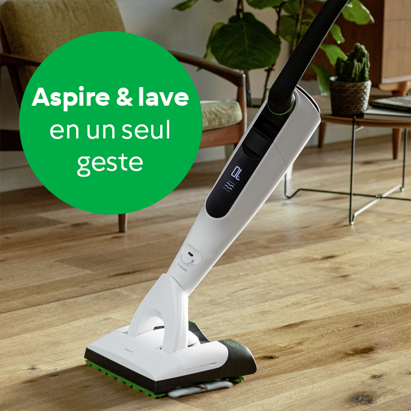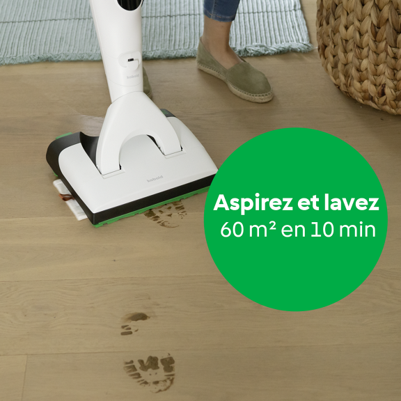 Découvrez le Pack Essentiel Kobold Aspire et Lave : l'aspirateur laveur capable d'aspirer et laver 60 m² et seulement 10 min, tout en utilisant 50 fois moins d'eau qu'une serpillère classique.