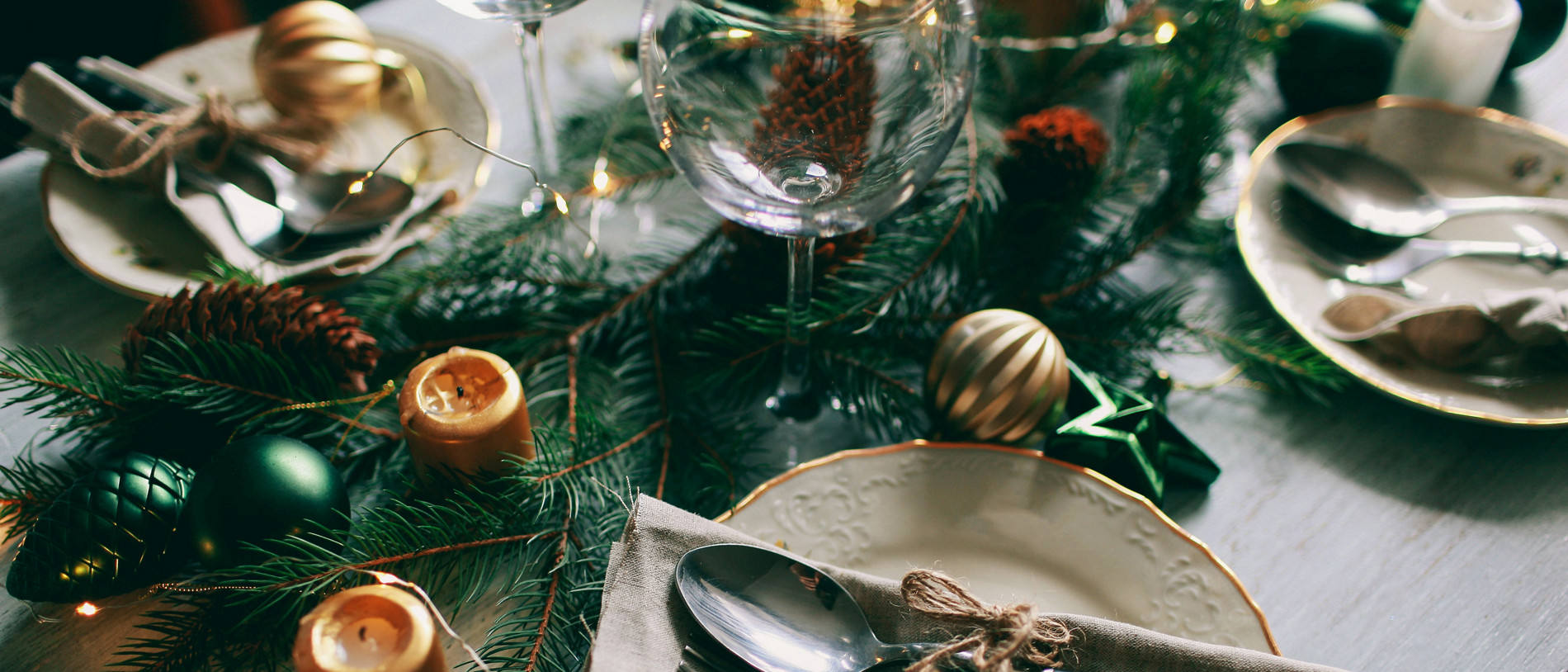 A beautiful centrepiece is the heart of your table. Arrange some fresh greenery, like pine, holly, or eucalyptus along the middle of the table. Add a few candles for warmth, and sprinkle in ornaments like tealights, miniature Christmas trees or pinecones for extra holiday spirit. If you’d rather keep it simple, a small holiday wreath with a candle in the centre works beautifully.